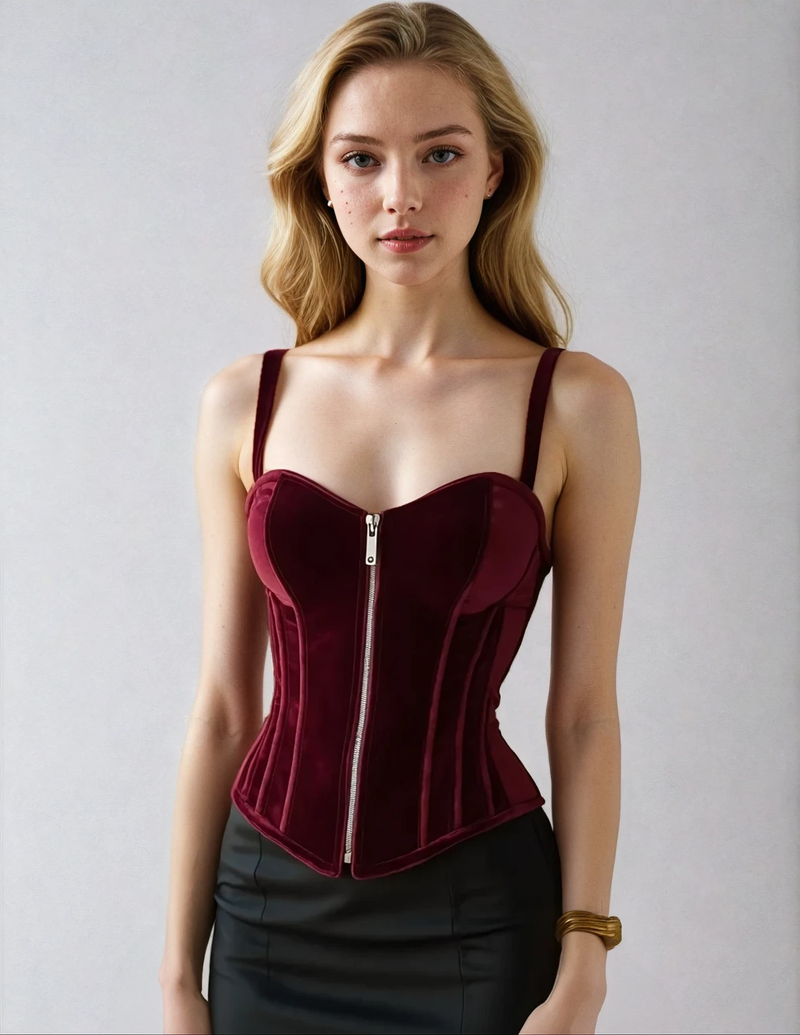 Experience elegance and support with the Adken Maroon Overbust Corset. Made from luxurious maroon velvet, this corset features a shoulder strap and front zipper for a comfortable and secure fit. Perfect for adding a touch of sophistication to any outfit.