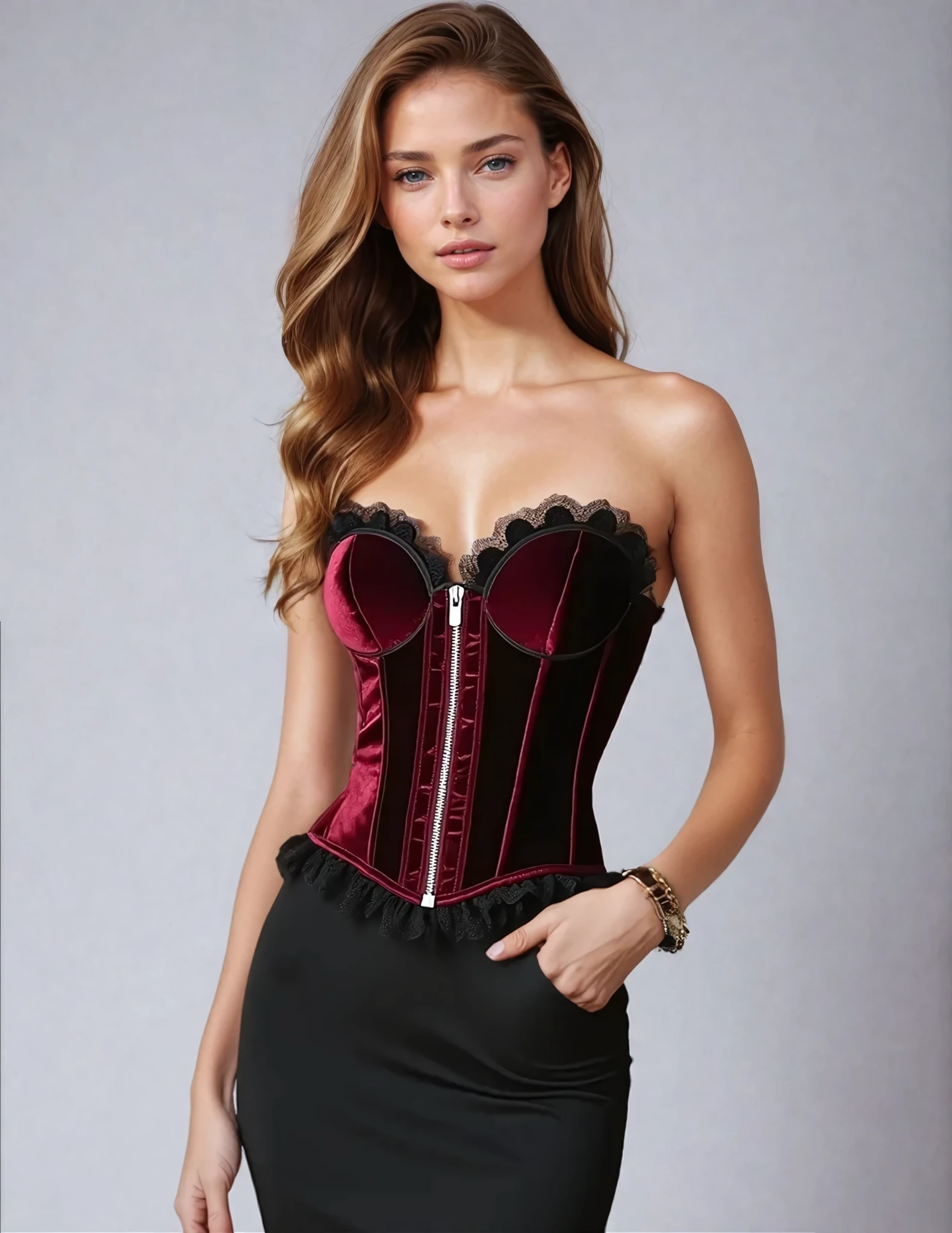 As an industry expert, I highly recommend the Bernadette Overbust Velvet Corset. Made with a luxurious maroon velvet fabric, this corset offers both style and functionality. With its lace frill detail and front zipper closure, it provides a comfortable and flattering fit. A must-have for any wardrobe.