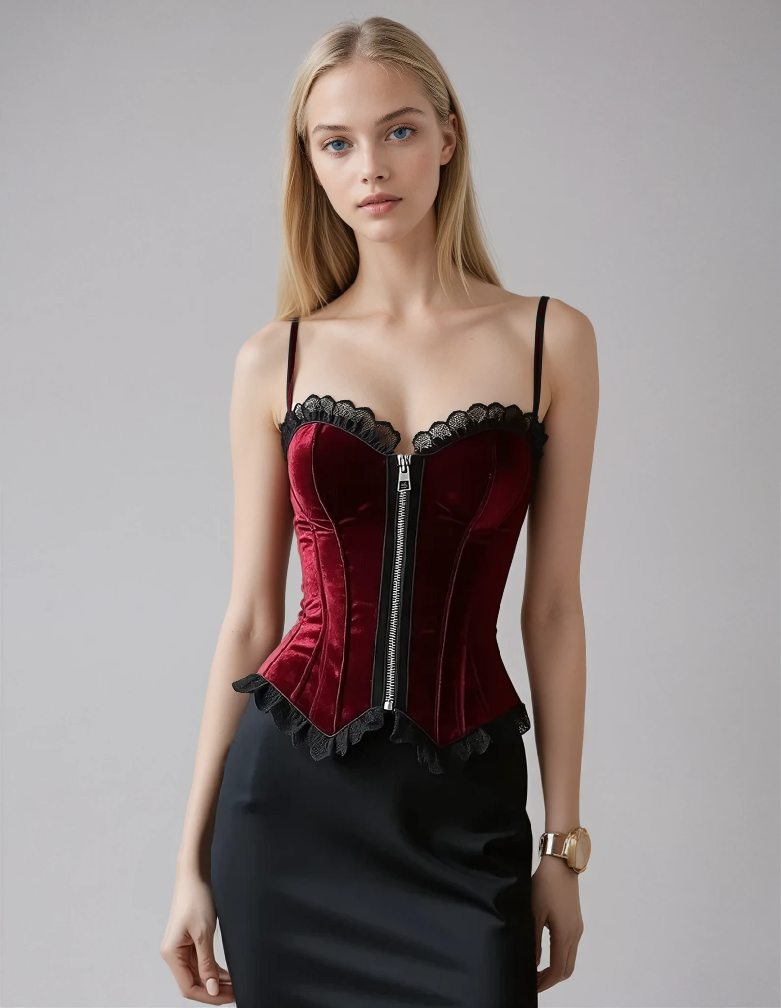 Expertly designed for both style and comfort, the Bertina Overbust Velvet Corset is the perfect addition to your wardrobe. The maroon color, shoulder straps, and lace frill give it a sophisticated look, while the front zipper opening allows for easy on and off. Upgrade your style with this must-have corset.