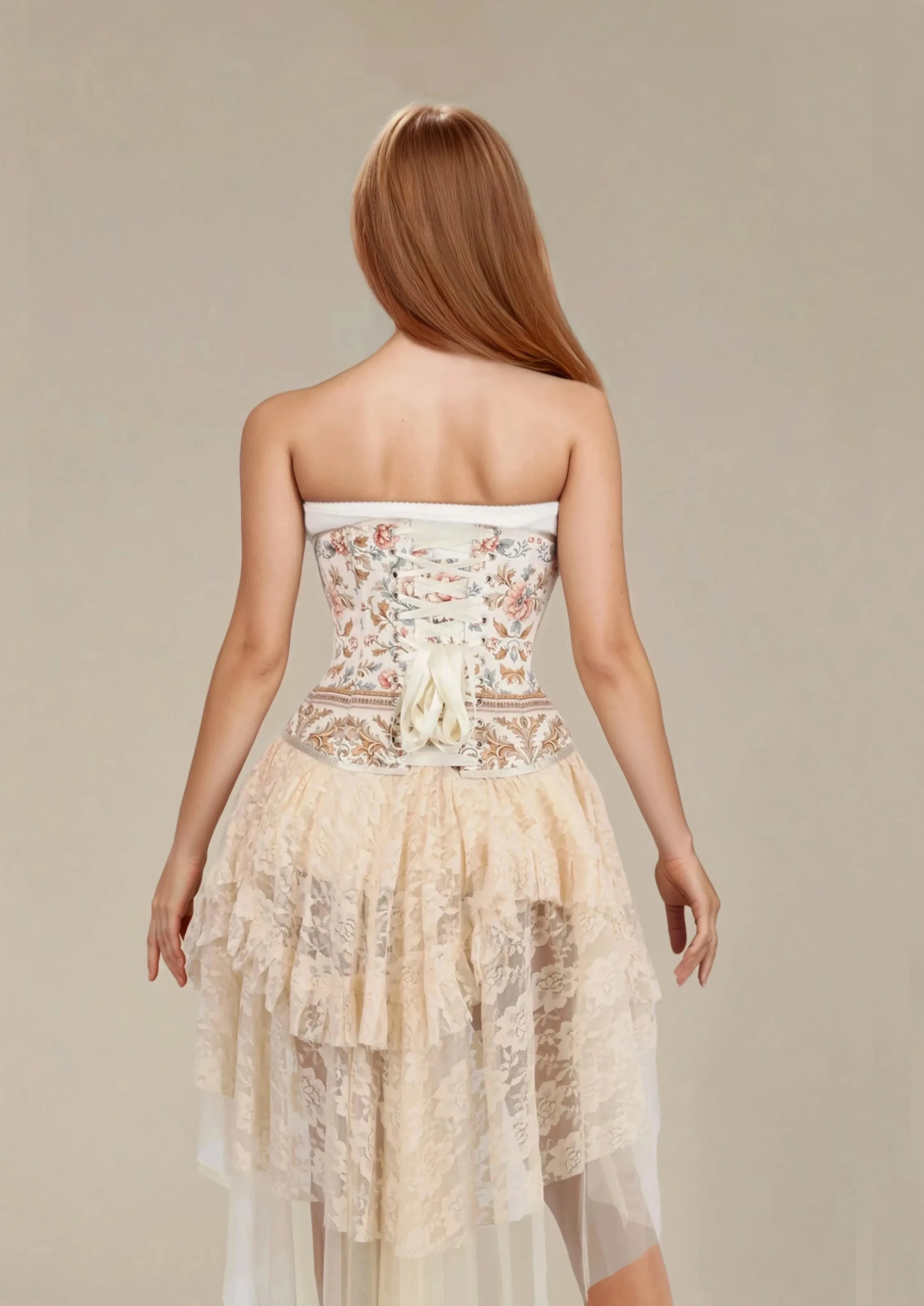 Introducing the Exclusive Underbust Corset, crafted from digitally printed fabric in a soft ivory base adorned with blooming floral motifs in shades of peach, blush, and muted greens. The intricate print is finished with a classic scrollwork border, lending an elegant, vintage-inspired aesthetic.