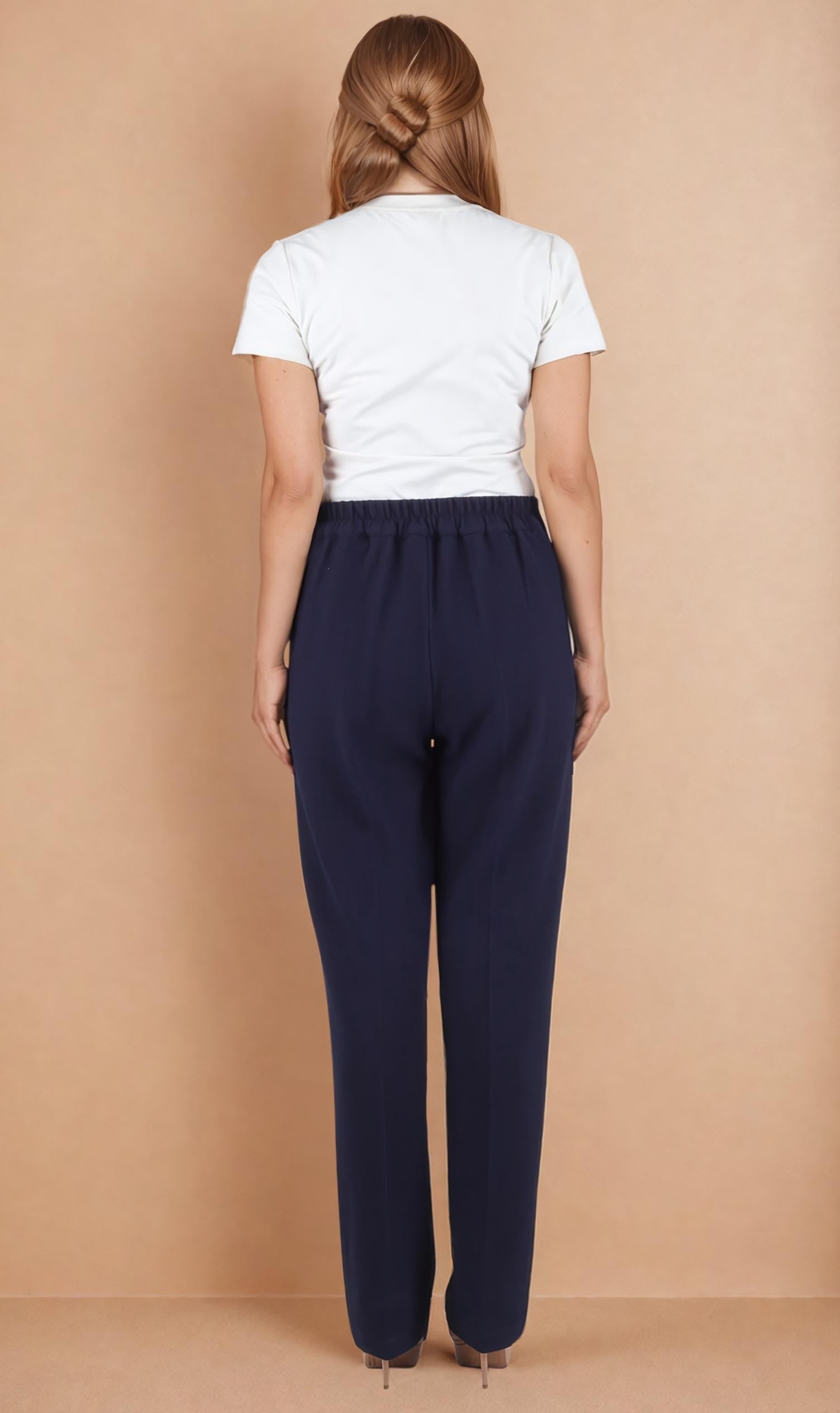 Introducing the Marnie Pleated Knitted Trouser in Navy blue. Made with high-quality poly knit material, these trousers are designed with pleats for a flattering fit. Perfect for a professional look or dressed down for a casual outfit, these trousers offer both style and comfort.