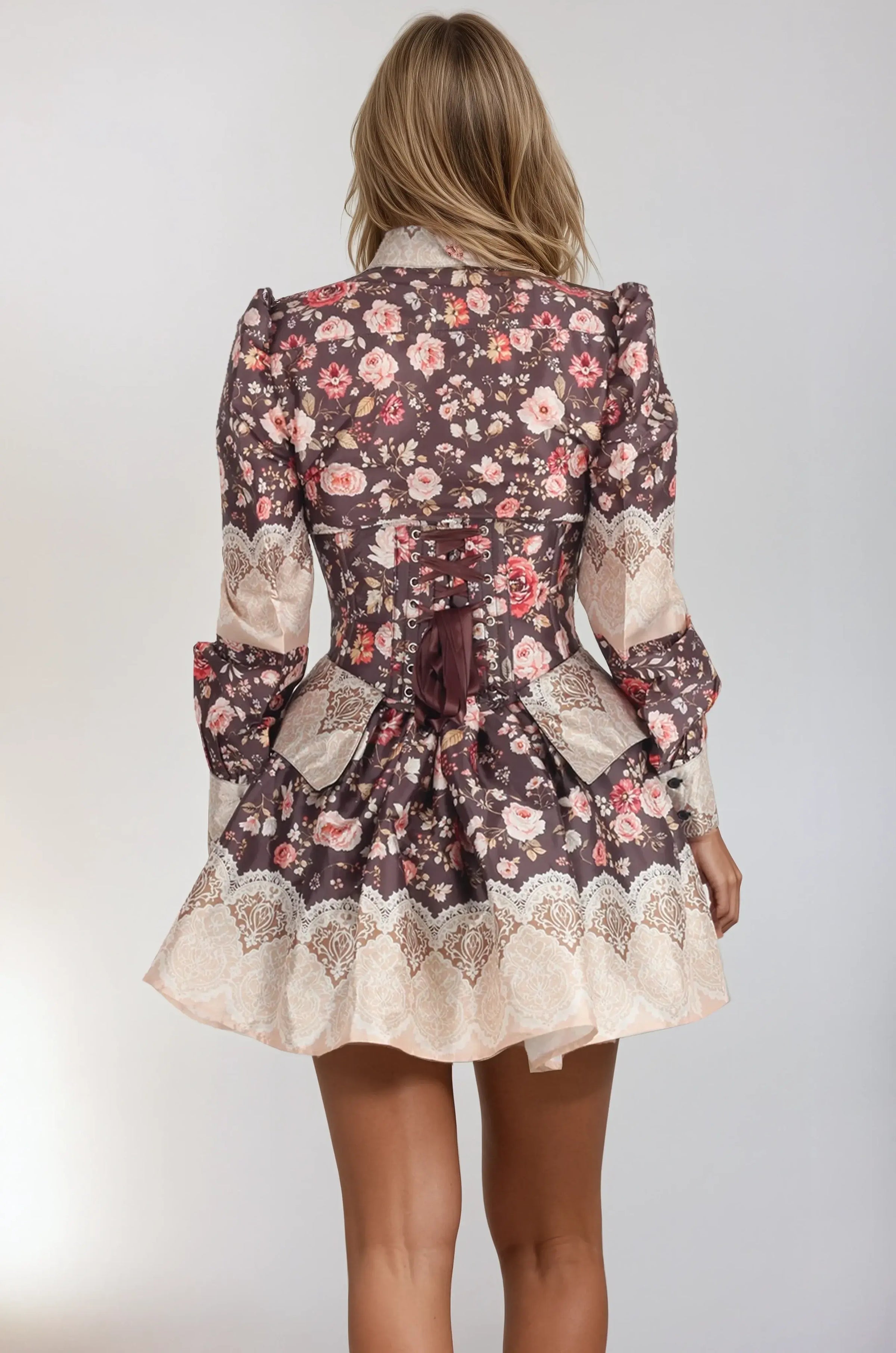 Underbust Steel Boned Corset: Designed to elegantly shape the waist, this corset features durable steel boning and back lacing, lined with 100% premium cotton for luxurious comfort. The soft blush and ivory florals paired with a rich brown background create a beautifully balanced, romantic silhouette.