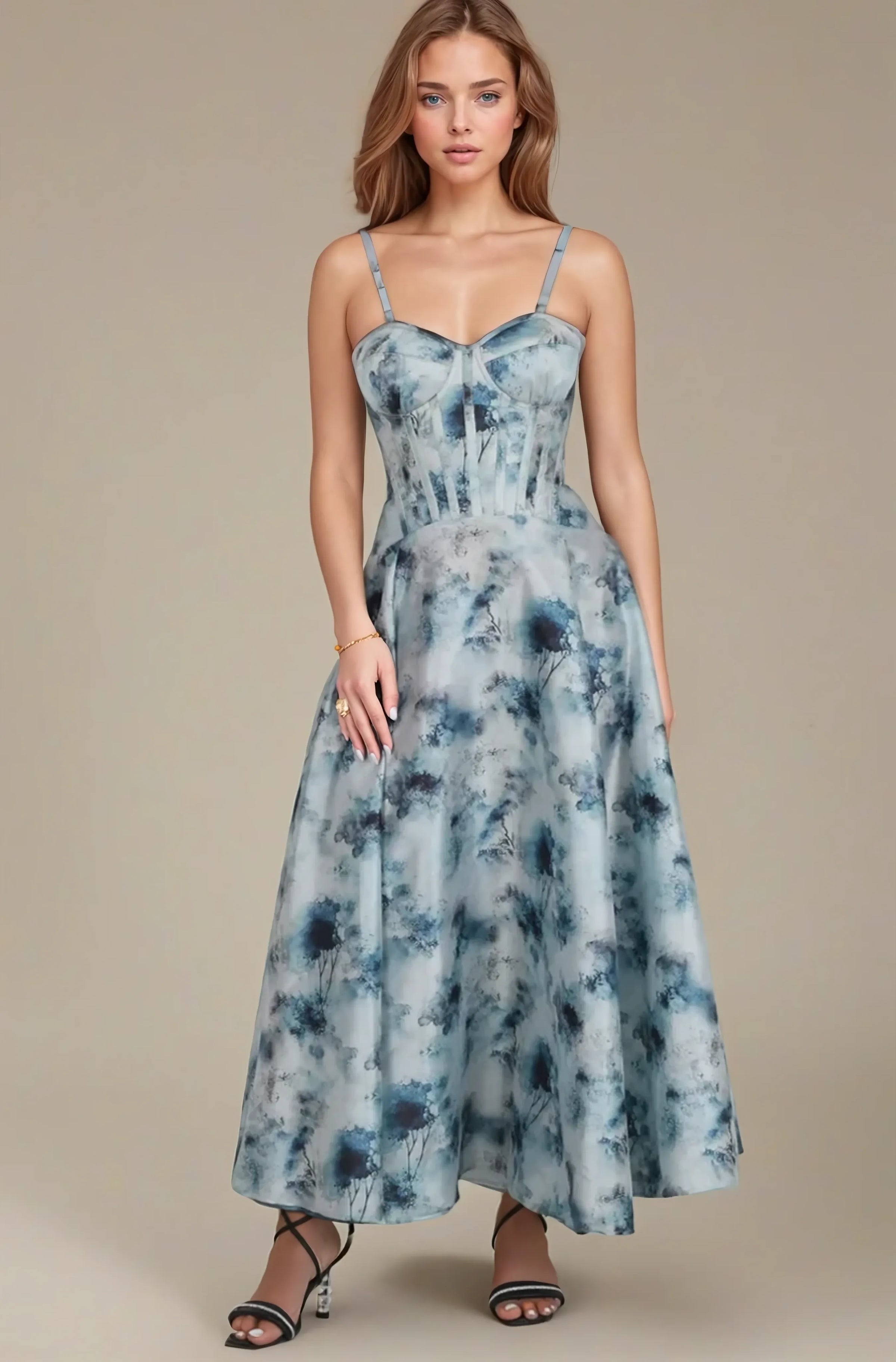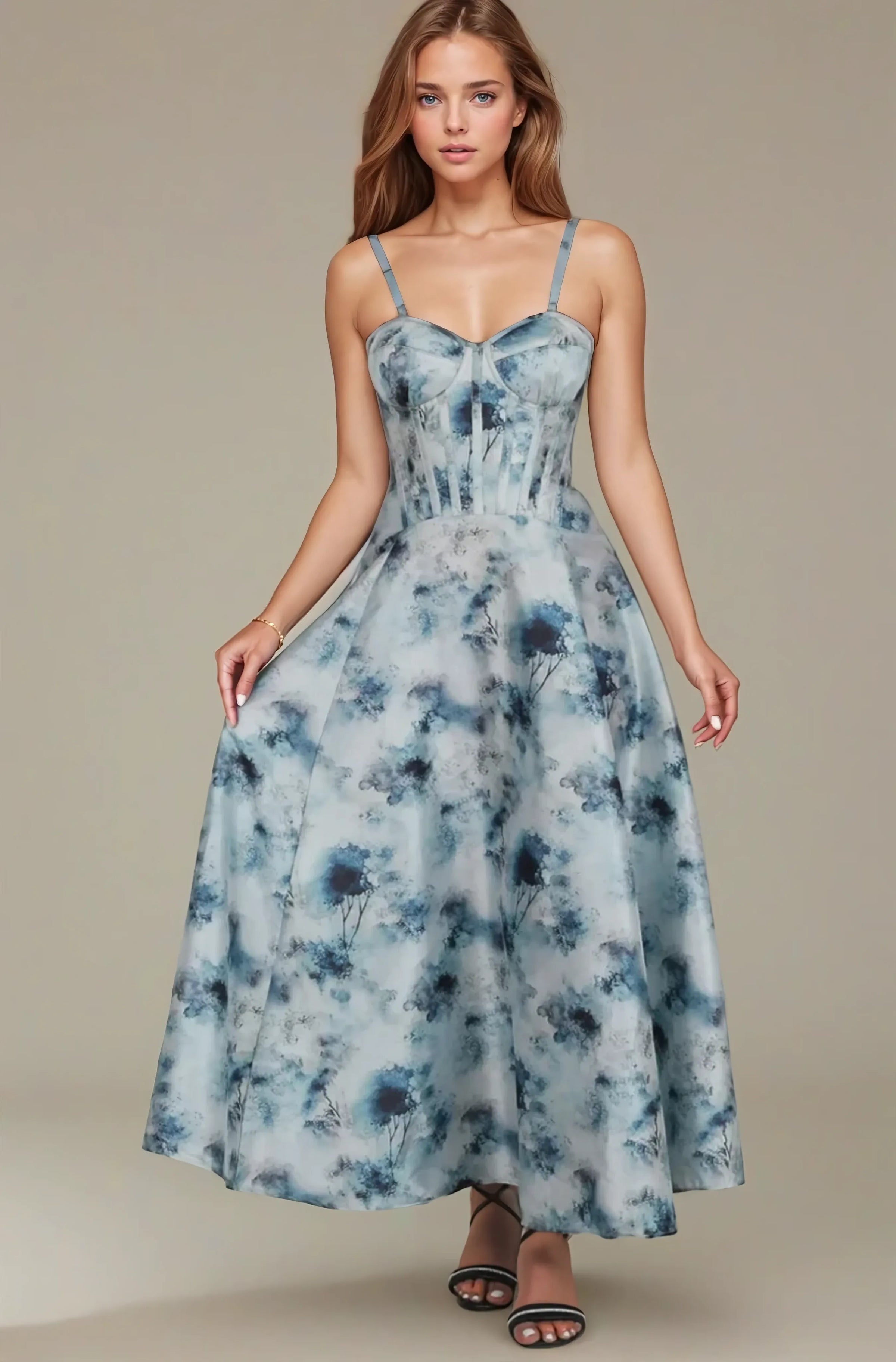 Turn heads in this dramatic printed taffeta corset dress, featuring a stunning blue and black floral pattern on a soft grey base. The bodice is expertly structured with spiral boning and lined with breathable cotton for a supportive, flattering fit, while wide shoulder straps and a sweetheart neckline add timeless elegance. The standout high-low skirt cascades with soft ruching and graceful volume, creating a flowy, sophisticated silhouette perfect for special occasions, evening events, or glamorous celebrations. Finished with a lace-up back for a customizable fit.
