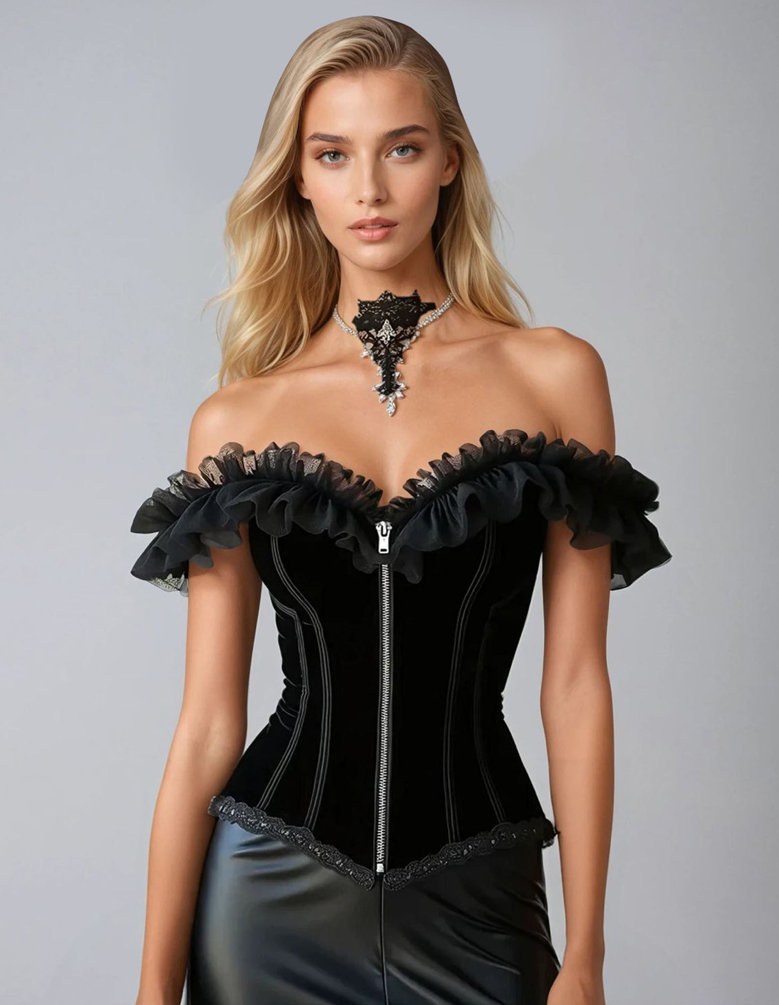 Introducing the elegant Dana Off Shoulder Velvet Corset. With its overbust design, delicate lace trim and front zipper closure, this corset hugs your curves and accentuates your figure. Made from luxurious velvet, this corset is perfect for special occasions and will make you feel confident and glamorous.