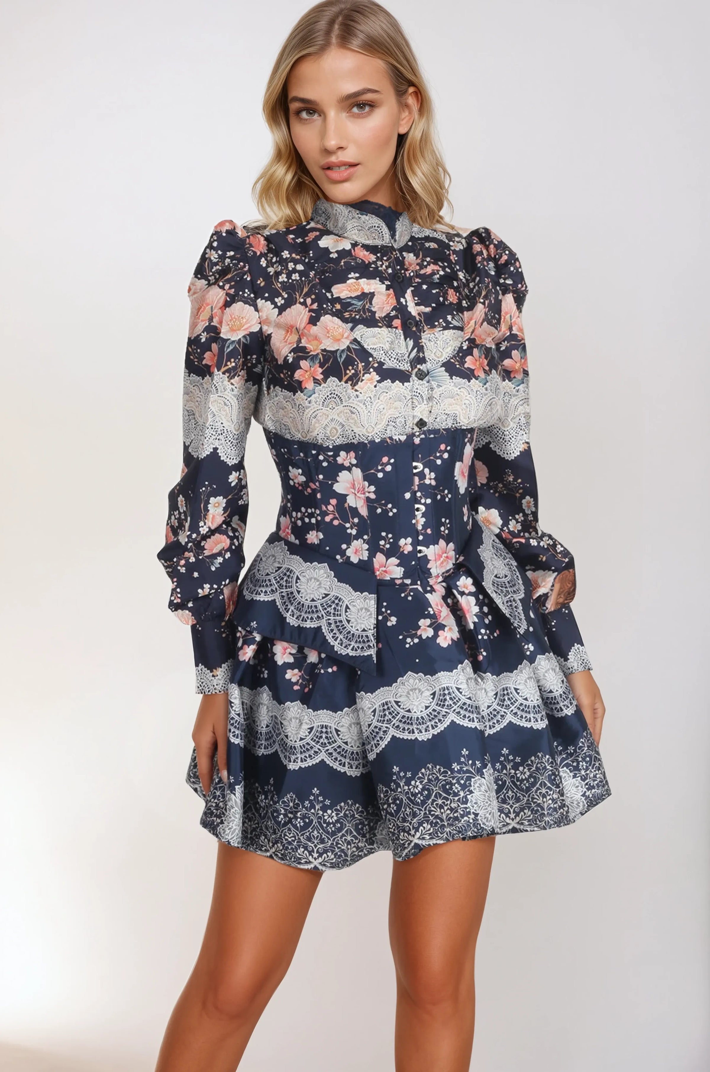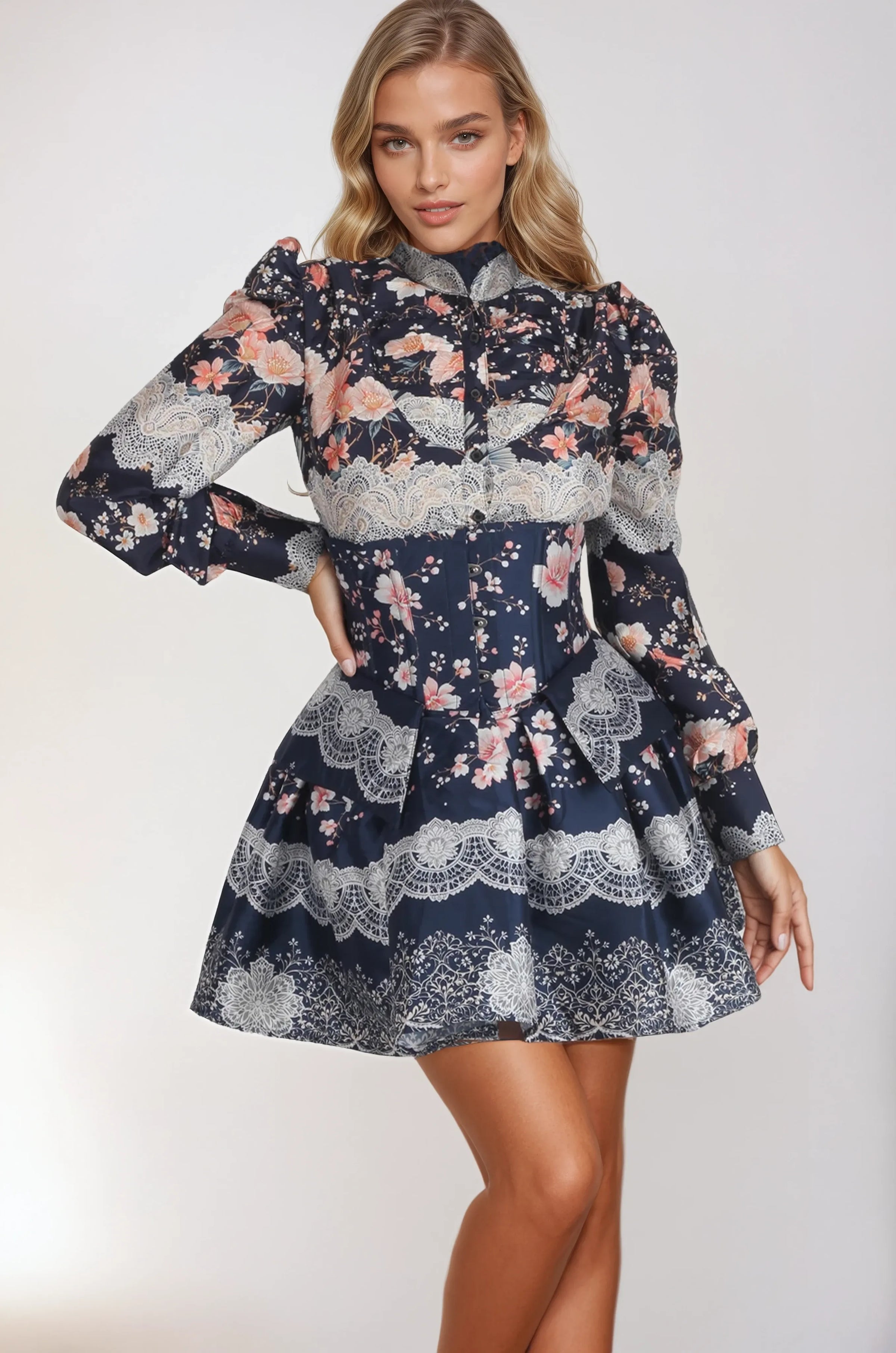 Underbust Steel Boned Corset: Designed with durable steel boning and back lacing, this corset cinches the waist beautifully while providing comfort with its 100% premium cotton lining. The floral and lace motif against the rich navy background brings a serene yet striking balance of femininity and sophistication.