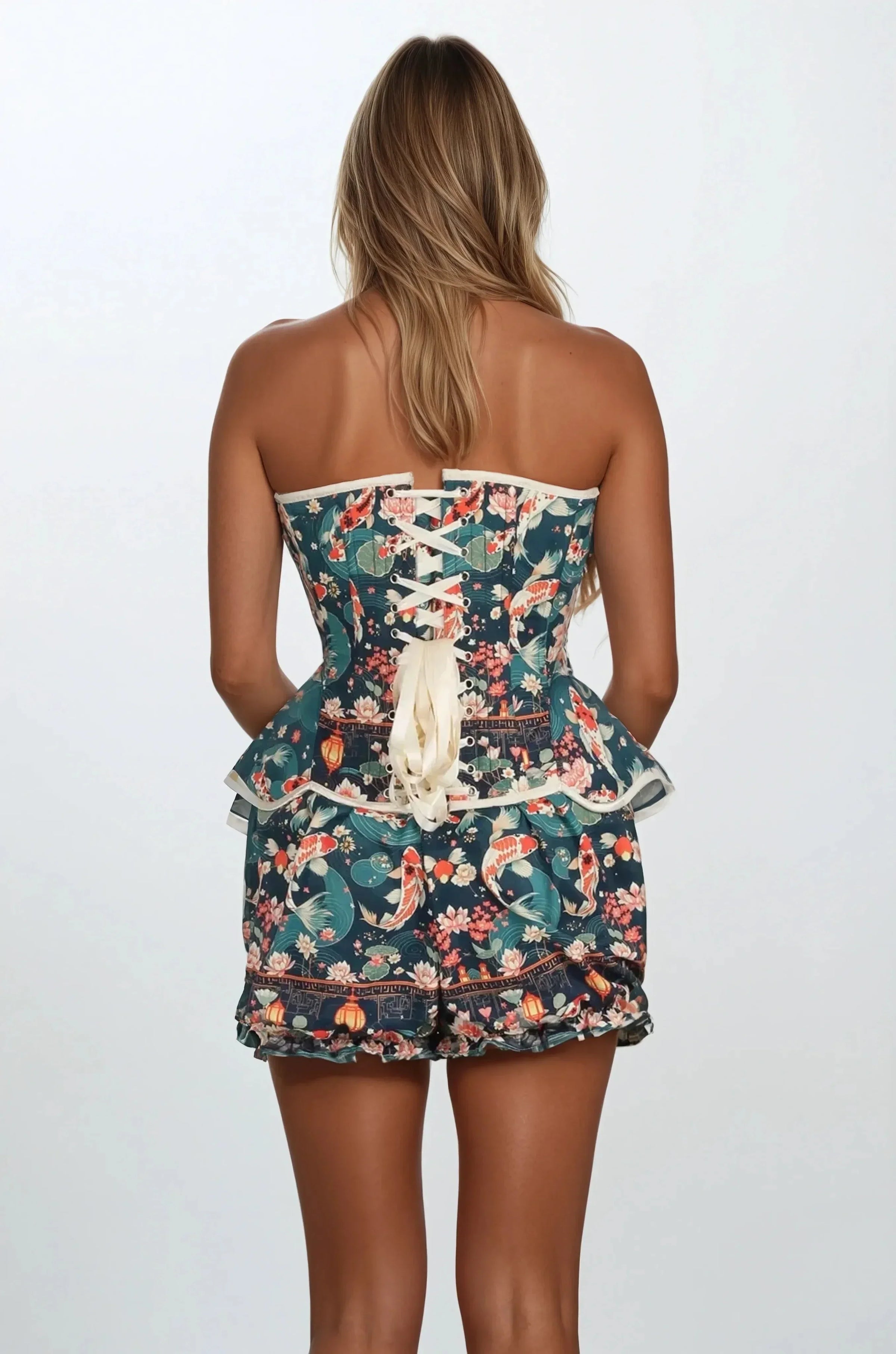 Make an enchanting impression with this two-piece set featuring an overbust corset in a lush koi fish and lotus blossom print. Made from printed taffeta and lined with soft cotton, the corset is structured with spiral boning for support and features a lace-up front with ivory ribbon. Hip gores sculpt the waist, creating a beautifully tailored silhouette. The matching bloomers offer a whimsical touch with elasticated ruffle hems, completing the look with playful charm. Ideal for themed events, fashion-forward outings, or romantic editorial styling.