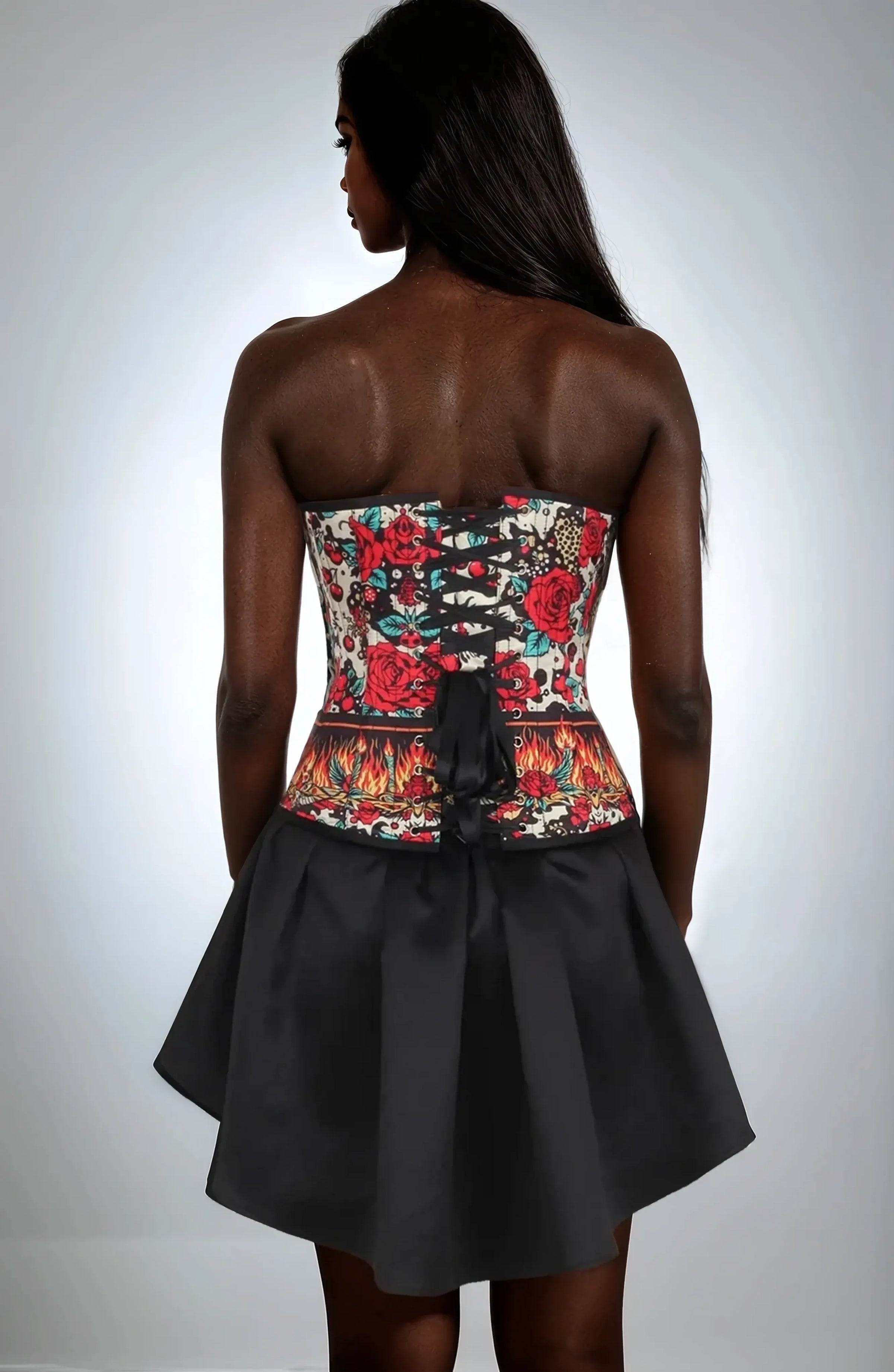 Embrace the vintage glamour of the Ellary Satin Overbust Corset. Adorned with a stunning Retro Roses & Flames digital print, this corset features durable steel bones and luxurious Duchess Satin fabric. Perfect for achieving a classic hourglass figure with support and style.