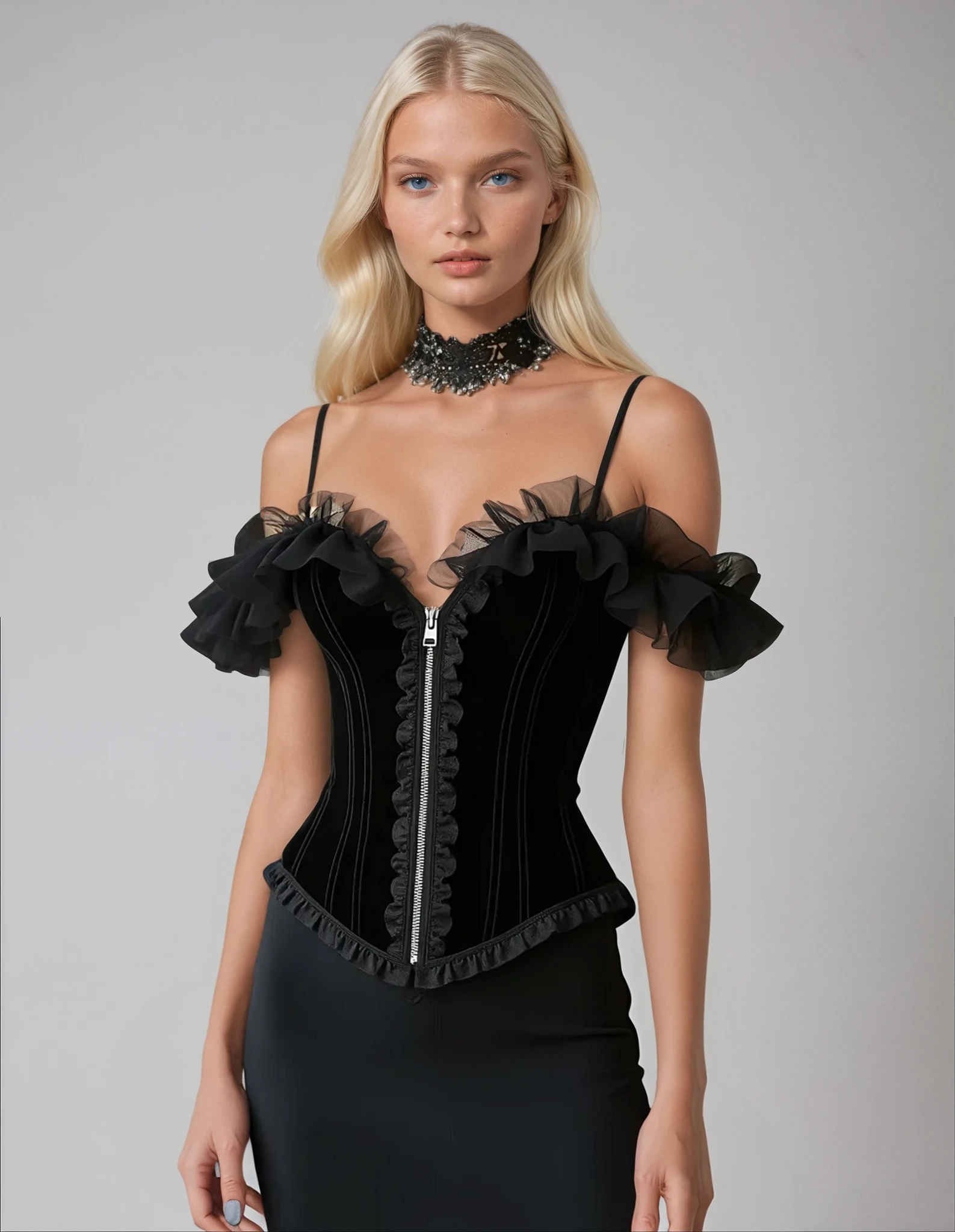 Elevate your style with the Gilgal Cold Shoulder Velvet Corset. This black corset features a front zipper opening and delicate lace trim, creating a chic and modern look. The cold shoulder design adds a touch of edginess to this velvet overbust corset, perfect for any fashion-forward individual