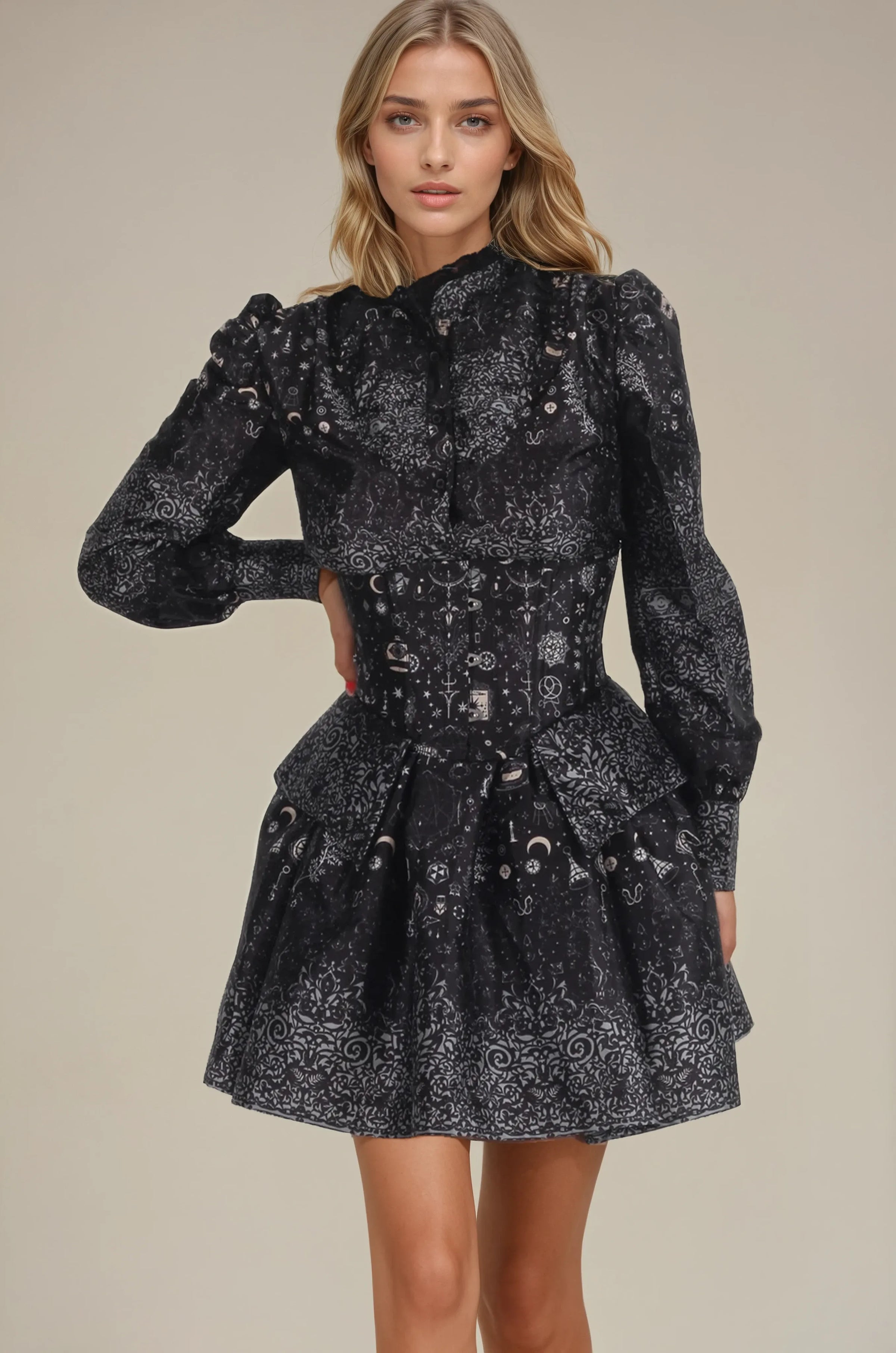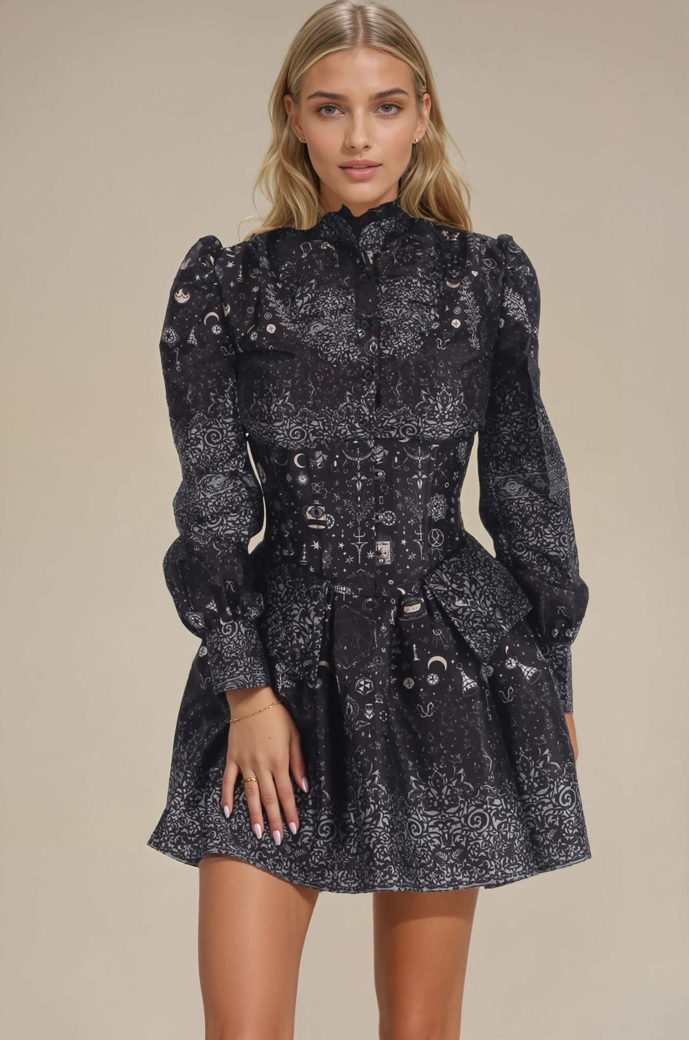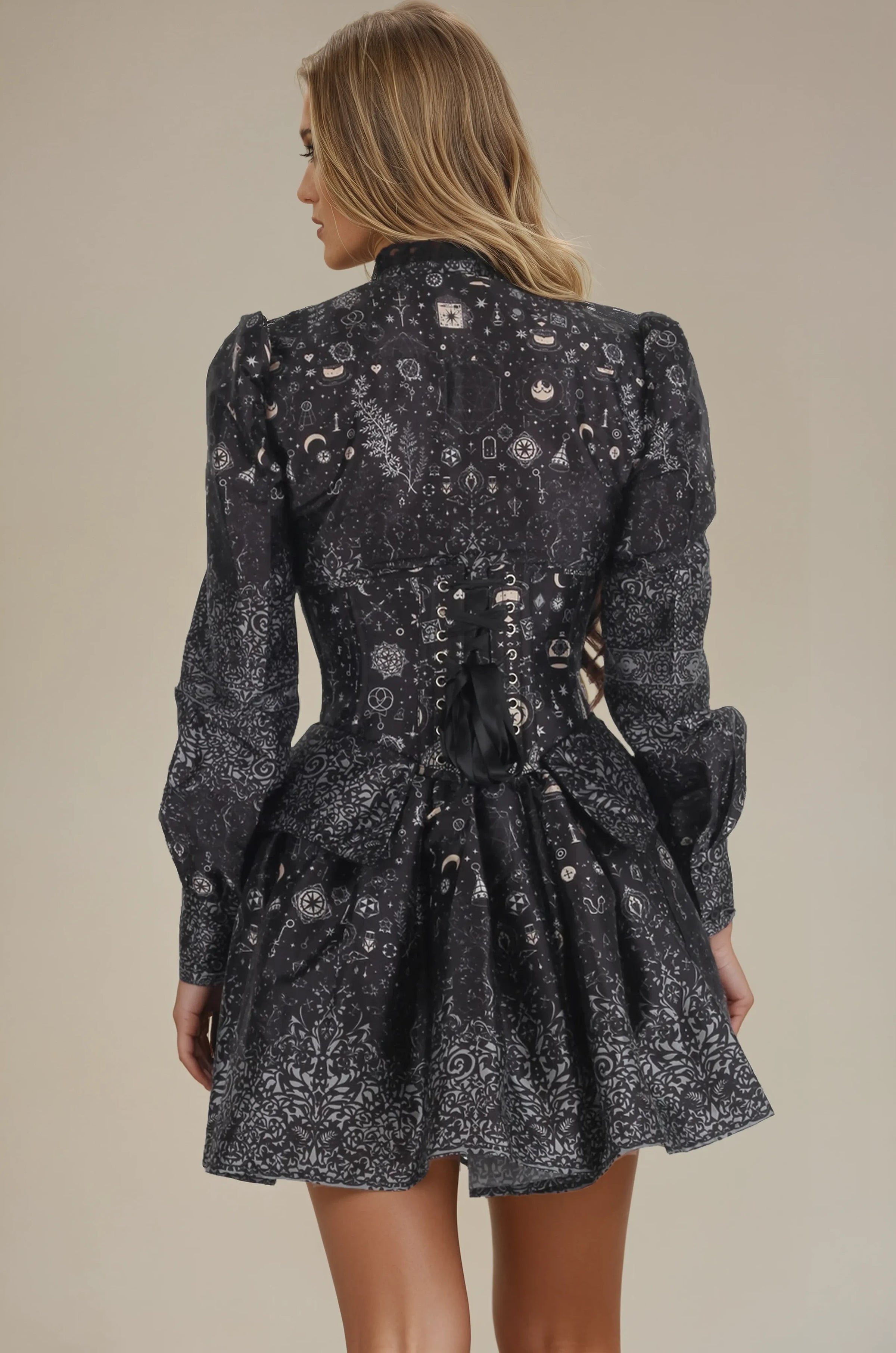 Underbust Steel Boned Corset: Built with strong steel boning and back lacing to elegantly define the waistline. Lined with 100% premium cotton, the corset delivers both comfort and structure. Its enchanting print features celestial symbols and cosmic designs, adding an air of mystery to your look.