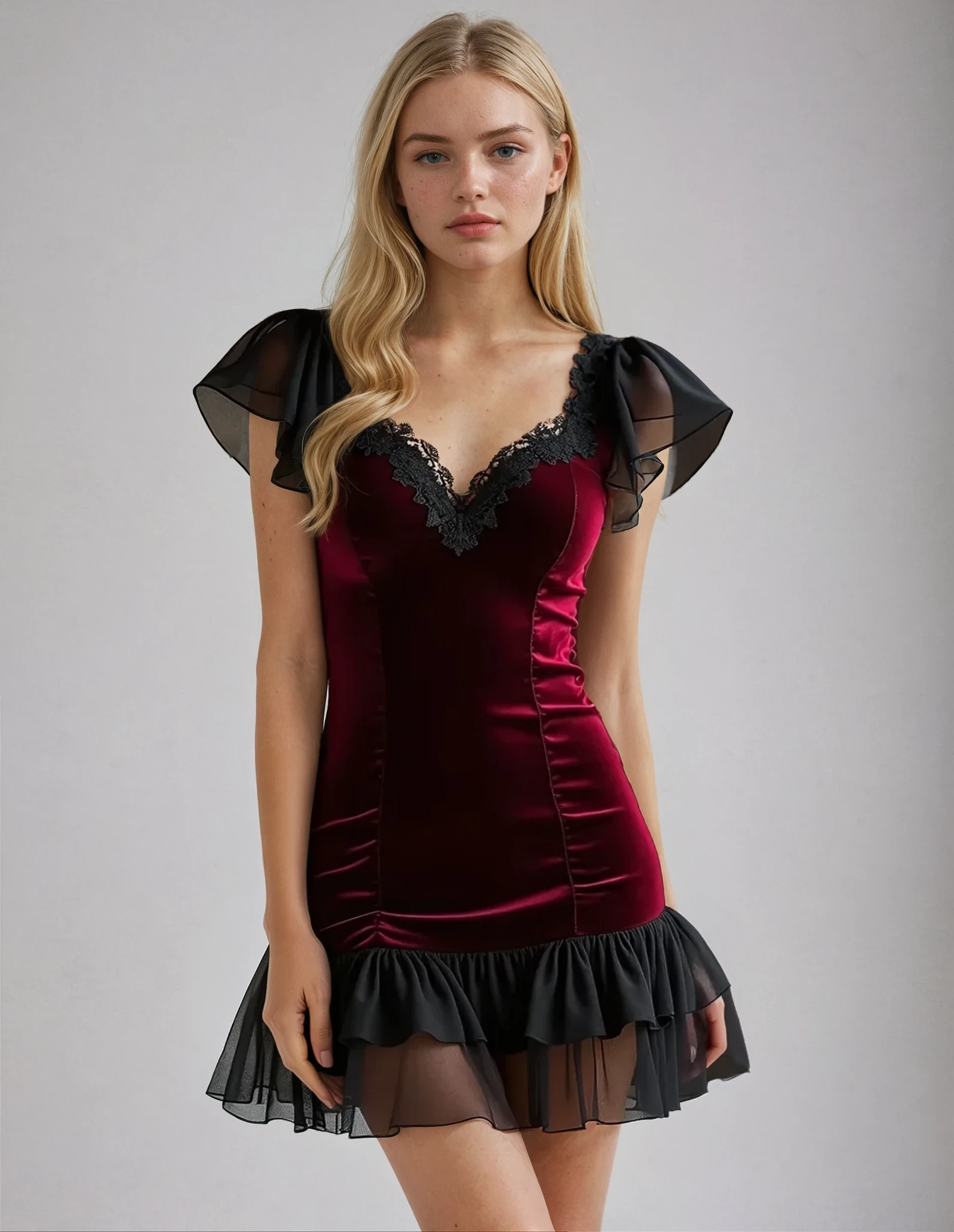 Model wearing an maroon velvet mini dress with a body-hugging fit, cap sleeve design, and flared bell sleeves. The dress features black lace trim at the neckline, and shoulders with a ruffled hemline and sheer tulle accents for a romantic, vintage-inspired look.