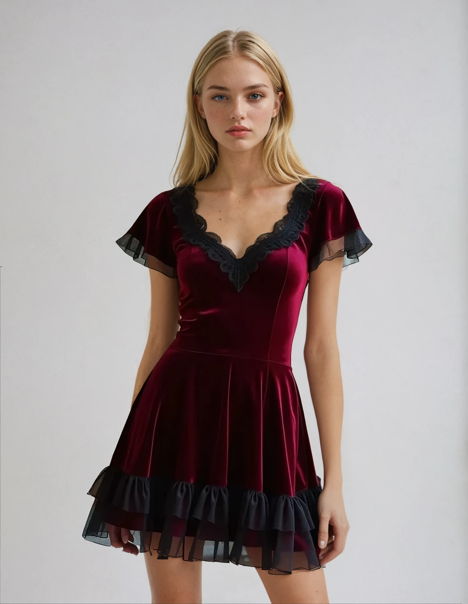 Model wearing an maroon velvet mini dress with a body-hugging fit, cap sleeve design, and flared bell sleeves. The dress features black lace trim at the neckline, shoulders, and hem, with a ruffled hemline and sheer tulle accents for a romantic, vintage-inspired look.