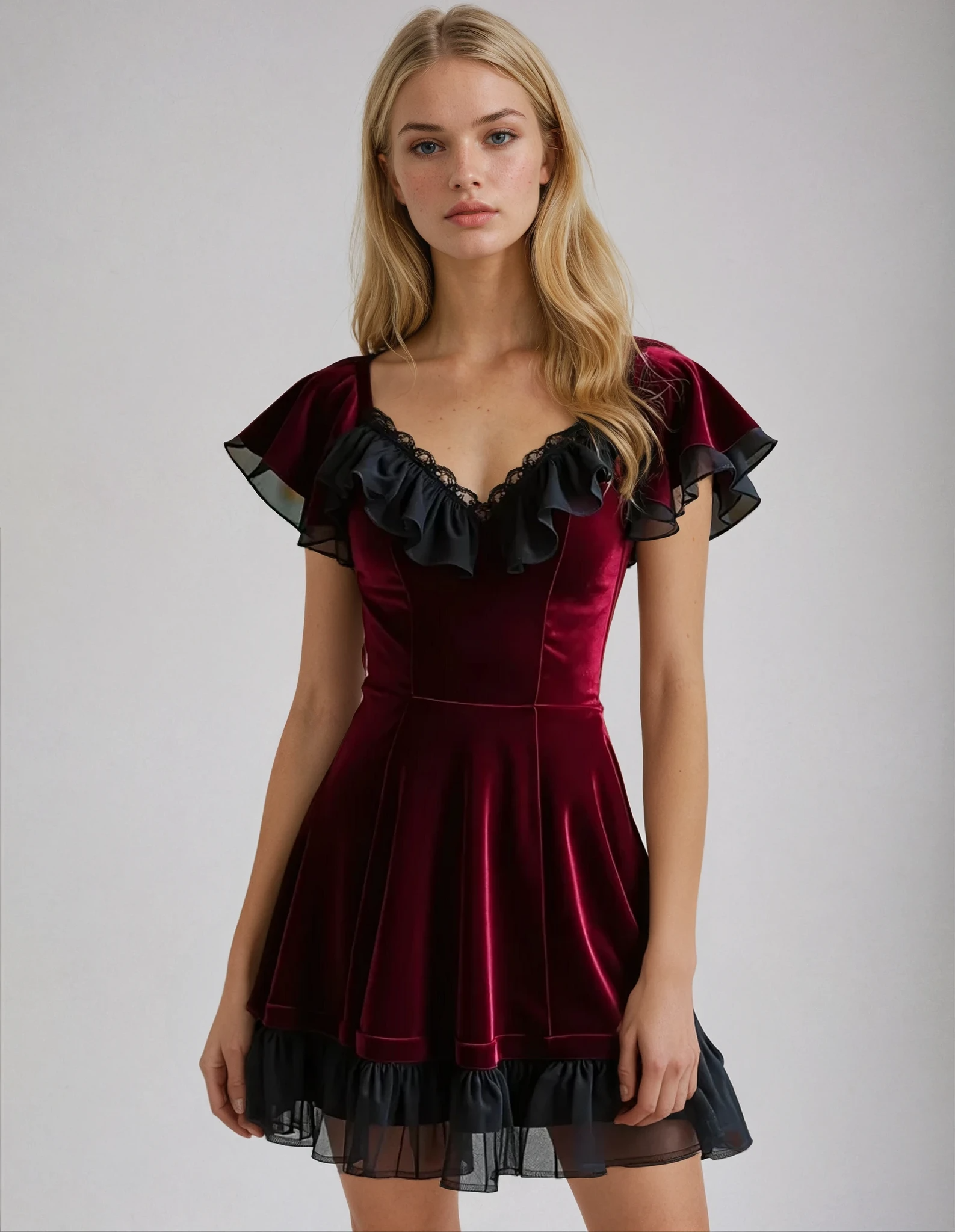 Model wearing an maroon velvet mini dress with a body-hugging fit, cap sleeve design, and flared bell sleeves. The dress features black lace trim at the neckline, shoulders, and hem, with a ruffled hemline and sheer tulle accents for a romantic, vintage-inspired look.