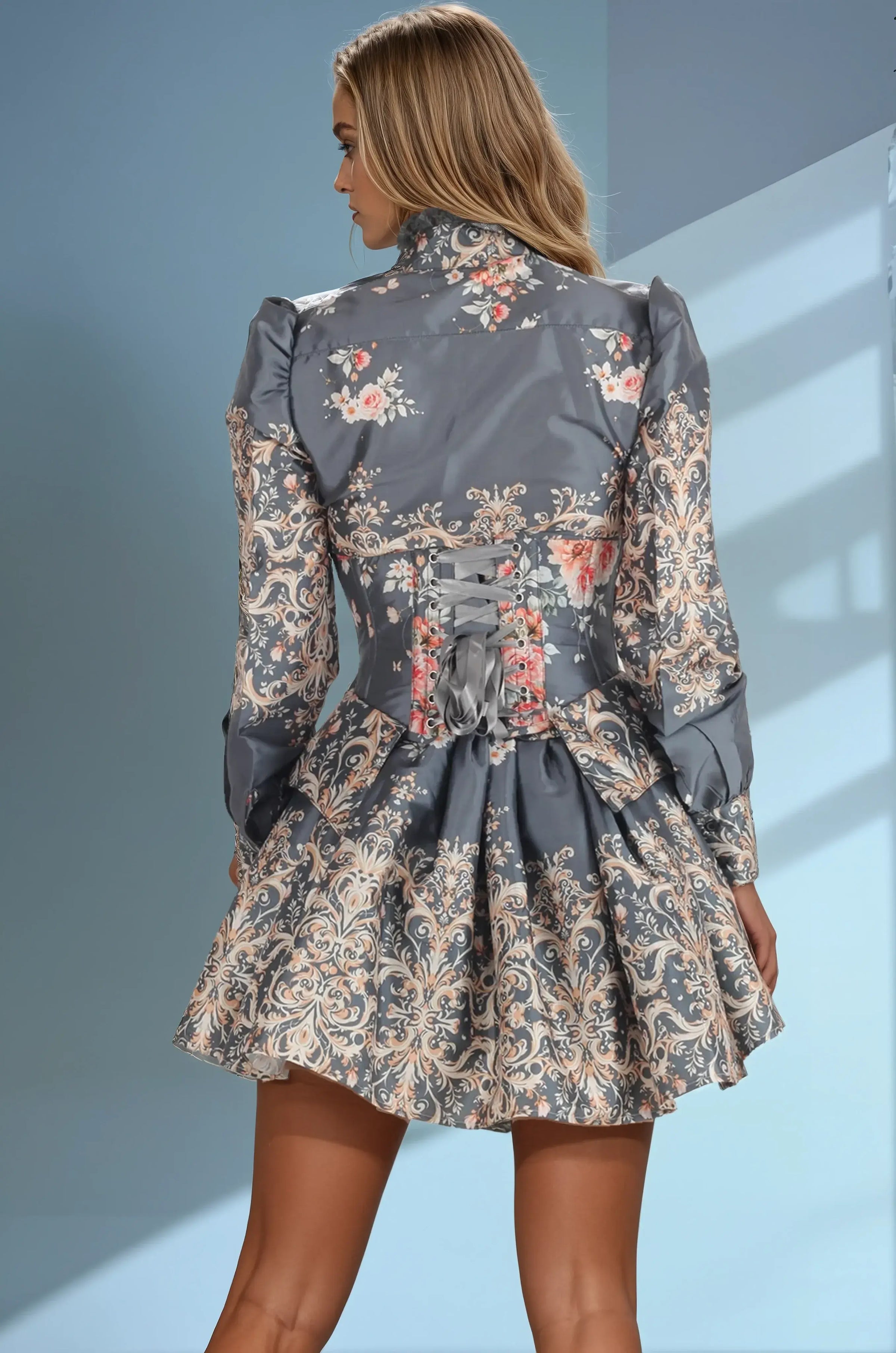 Step into refined elegance with our New LUXE NOIR Three-Piece Costume Set in the Silver Bloom Edition. This sophisticated ensemble features a luxurious steel-grey satin base adorned with intricate peach baroque patterns and delicate pastel florals, creating a perfect balance of grace and grandeur.