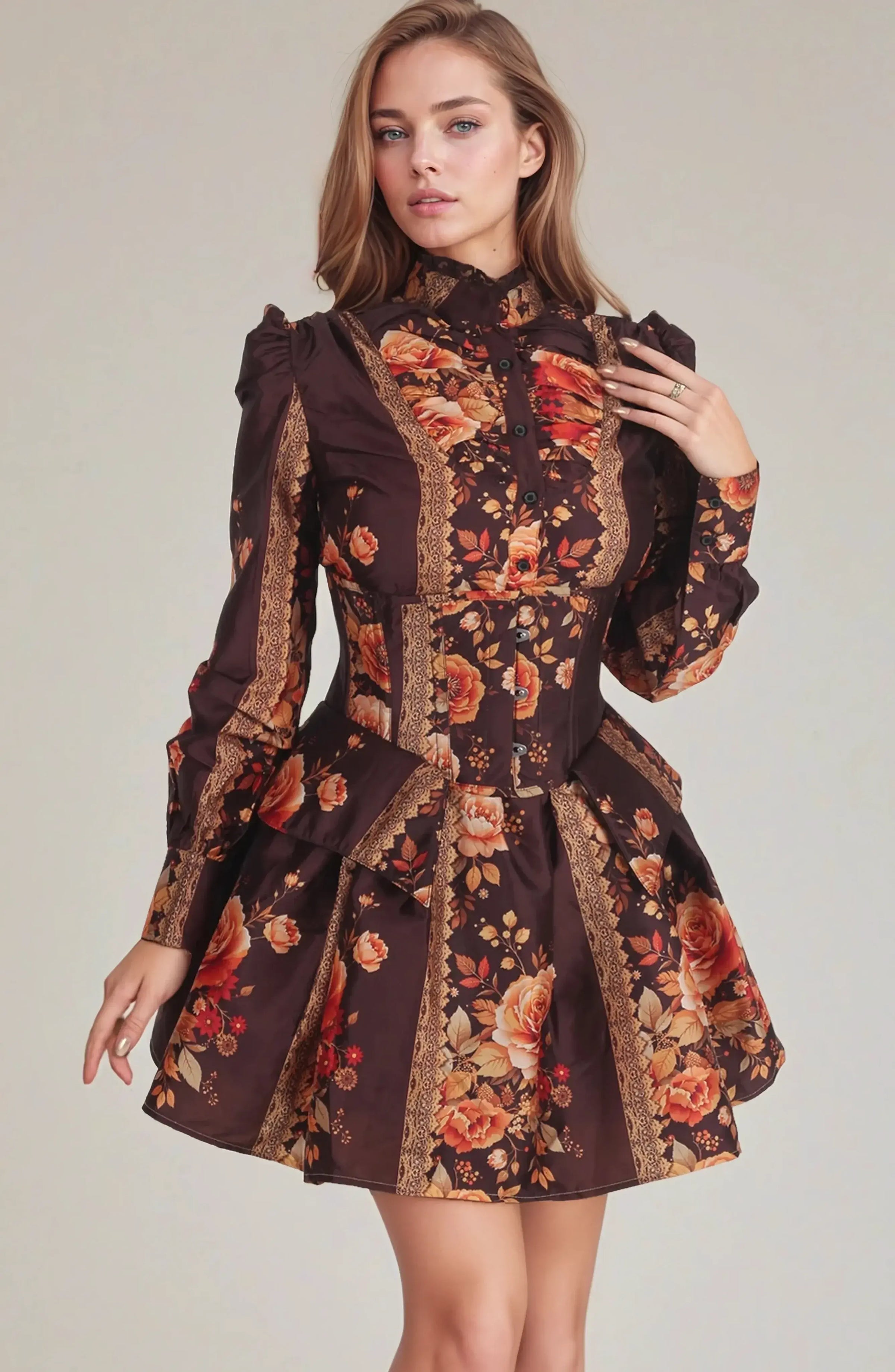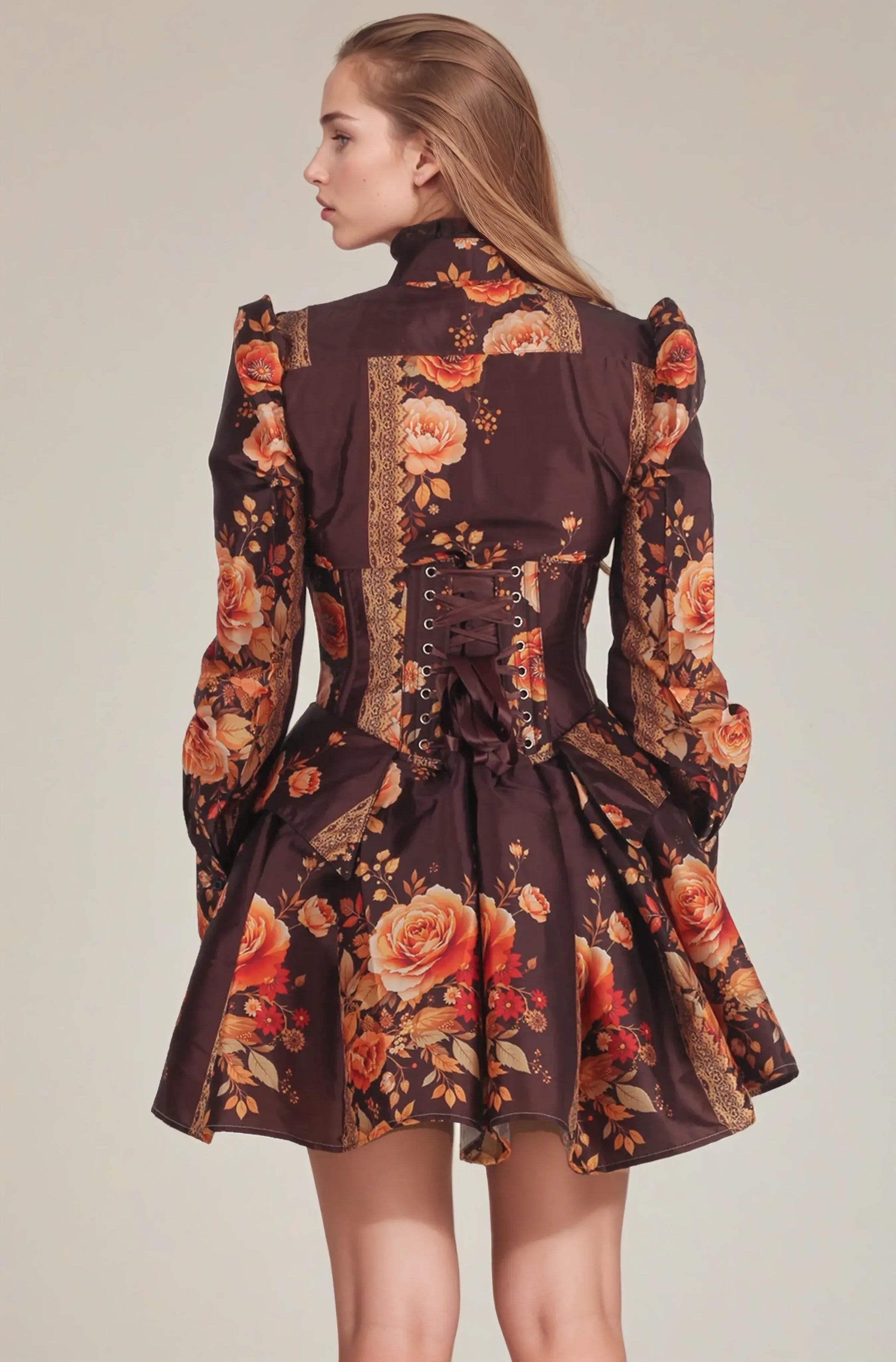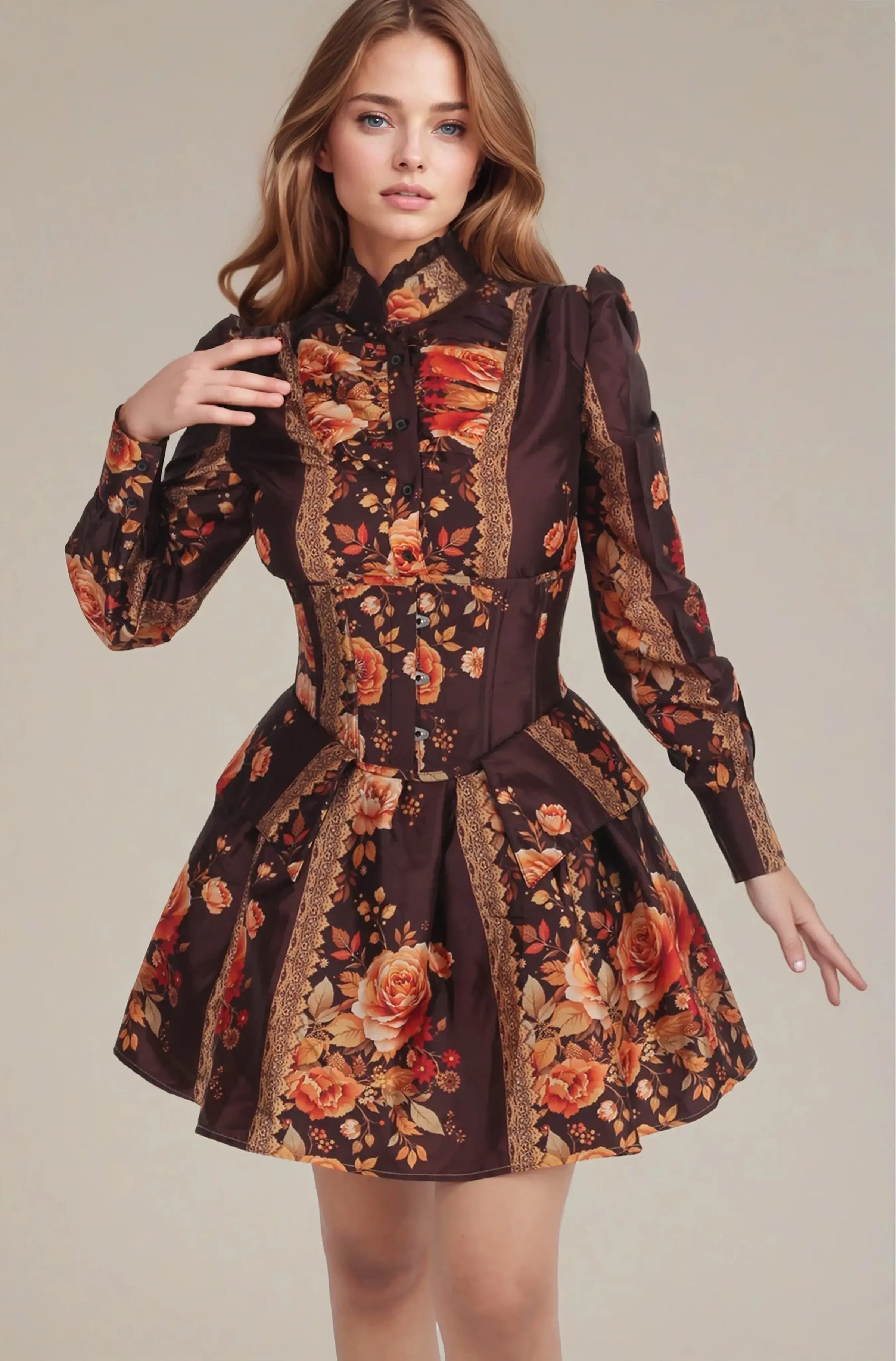 Shirt: A high lace-trimmed collar and gathered puffed sleeves complete the look with vintage romance. The bold floral design contrasts beautifully against the rich burgundy fabric, creating a perfect balance of drama and elegance.