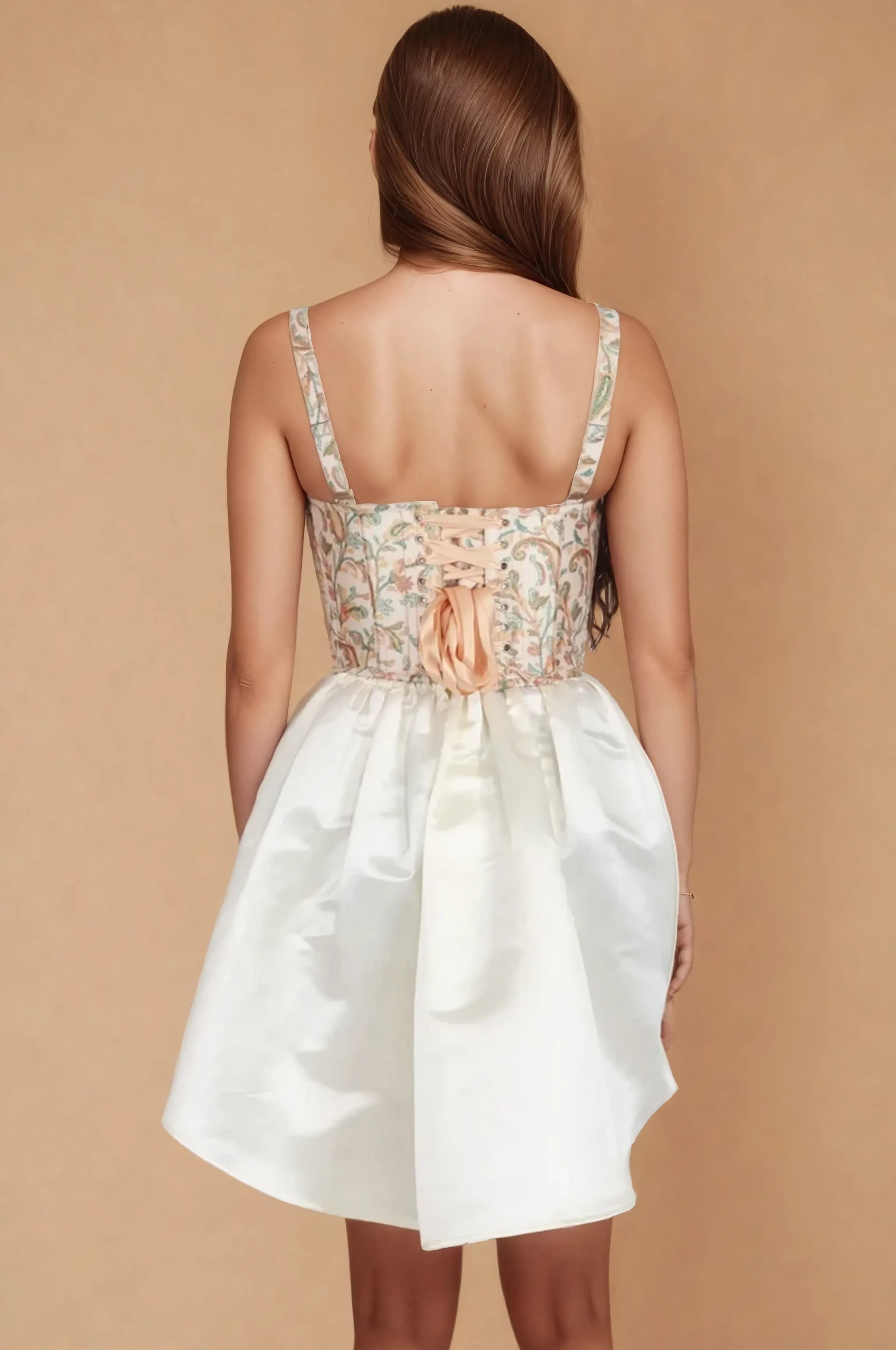 Turn heads in this dramatic printed taffeta corset top, featuring a stunning blue and black floral pattern on a soft grey base. The bodice is expertly structured with spiral boning and lined with breathable cotton for a supportive, flattering fit, while wide shoulder straps and a sweetheart neckline add timeless elegance.