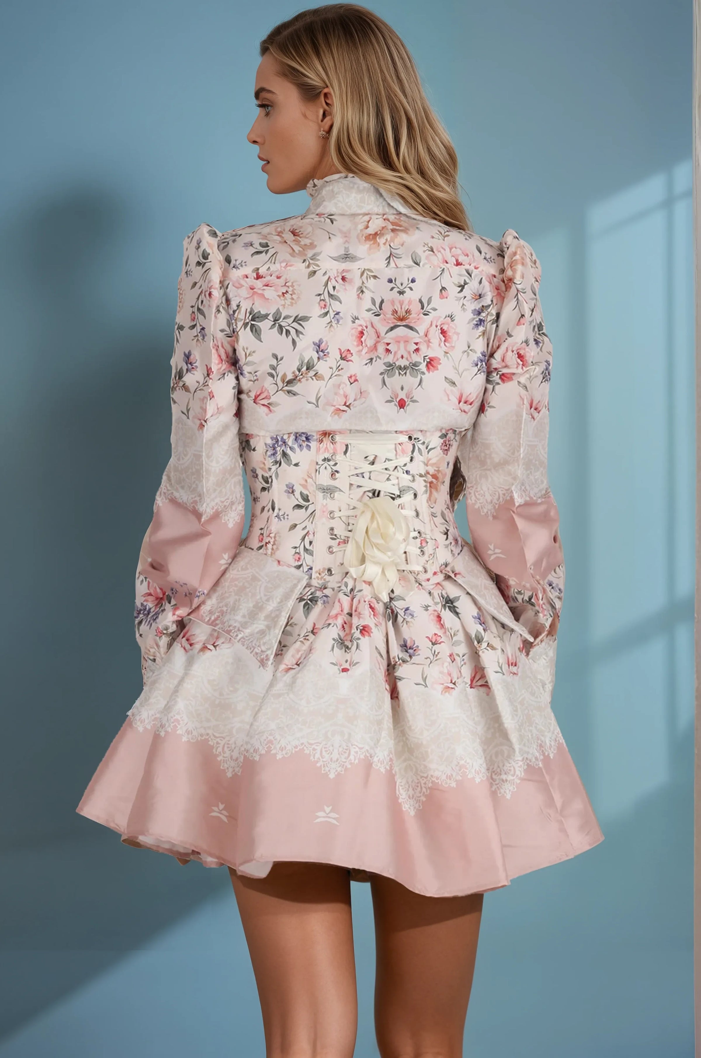 Skirt with Cancan: Flowing and full, the voluminous skirt features beautifully arranged pastel florals accented by lace-like borders and a blush pink hemline. The built-in cancan adds dramatic fullness, perfect for elegant twirls and a captivating silhouette.