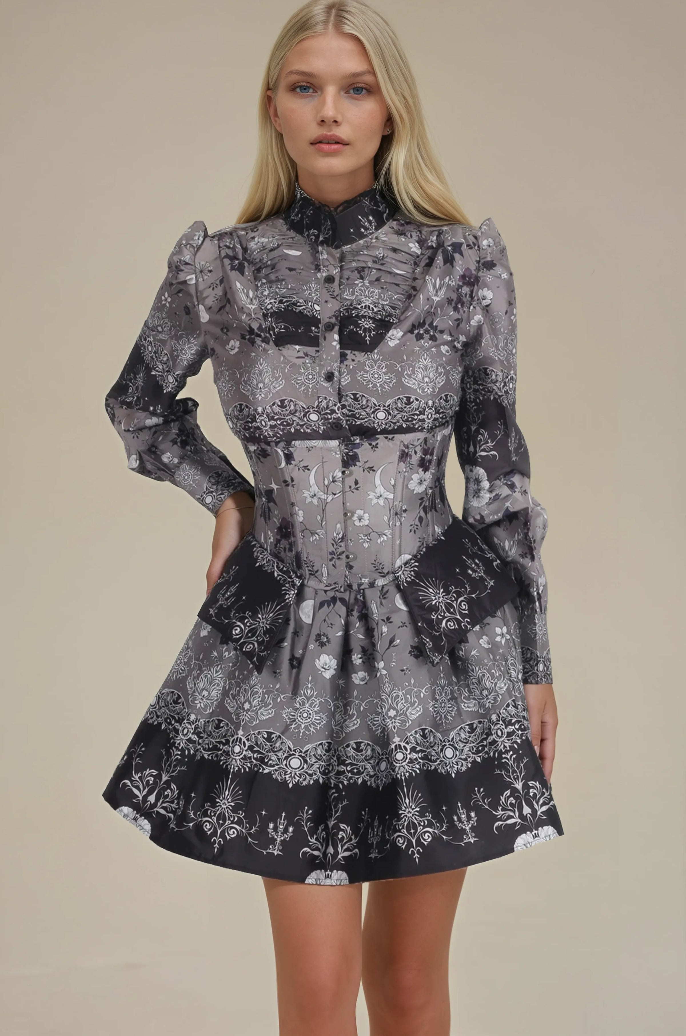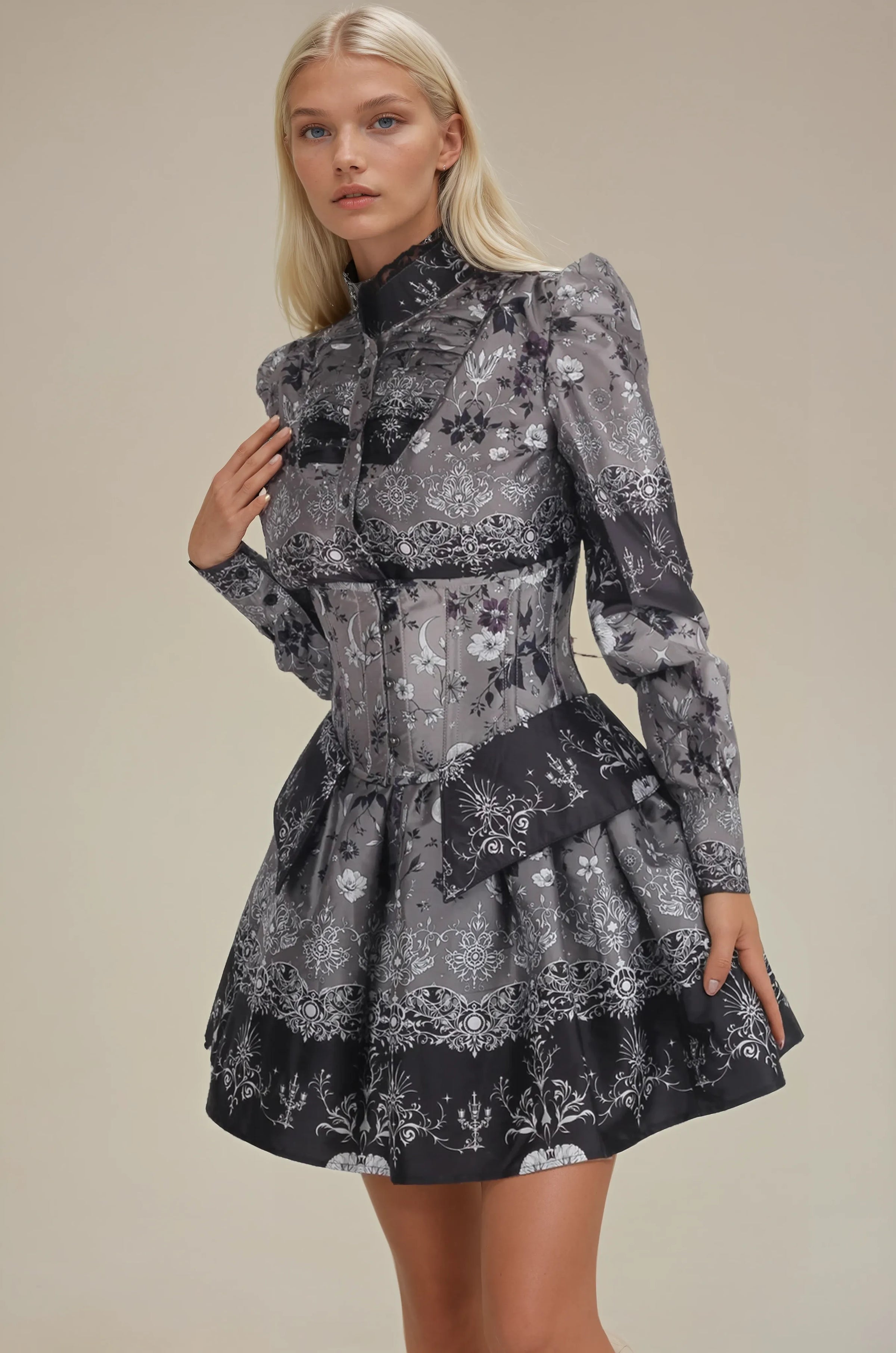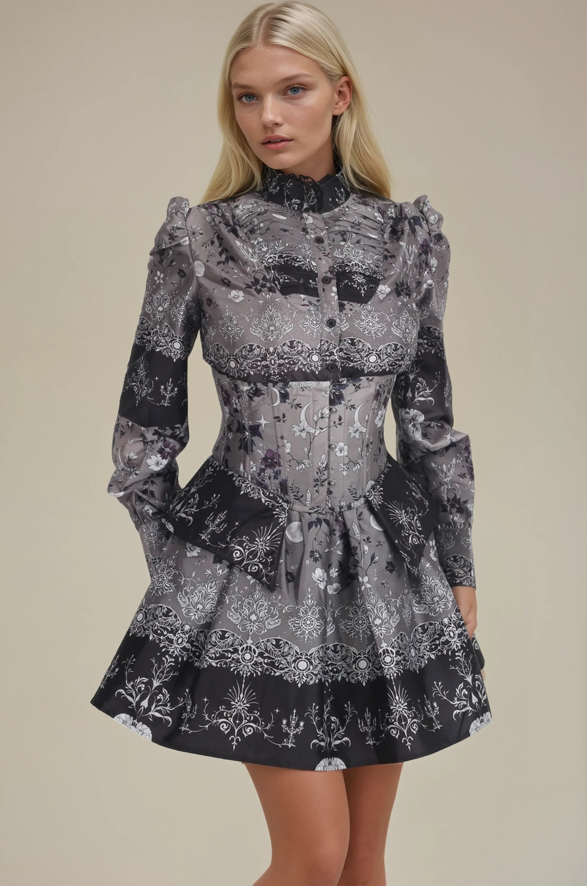 Shirt: Completing the ensemble is a high lace-trimmed collar shirt with ruched detailing and romantic puffed sleeves. The coordinated floral and celestial prints evoke a sense of timeless magic, balancing soft femininity with gothic grandeur.