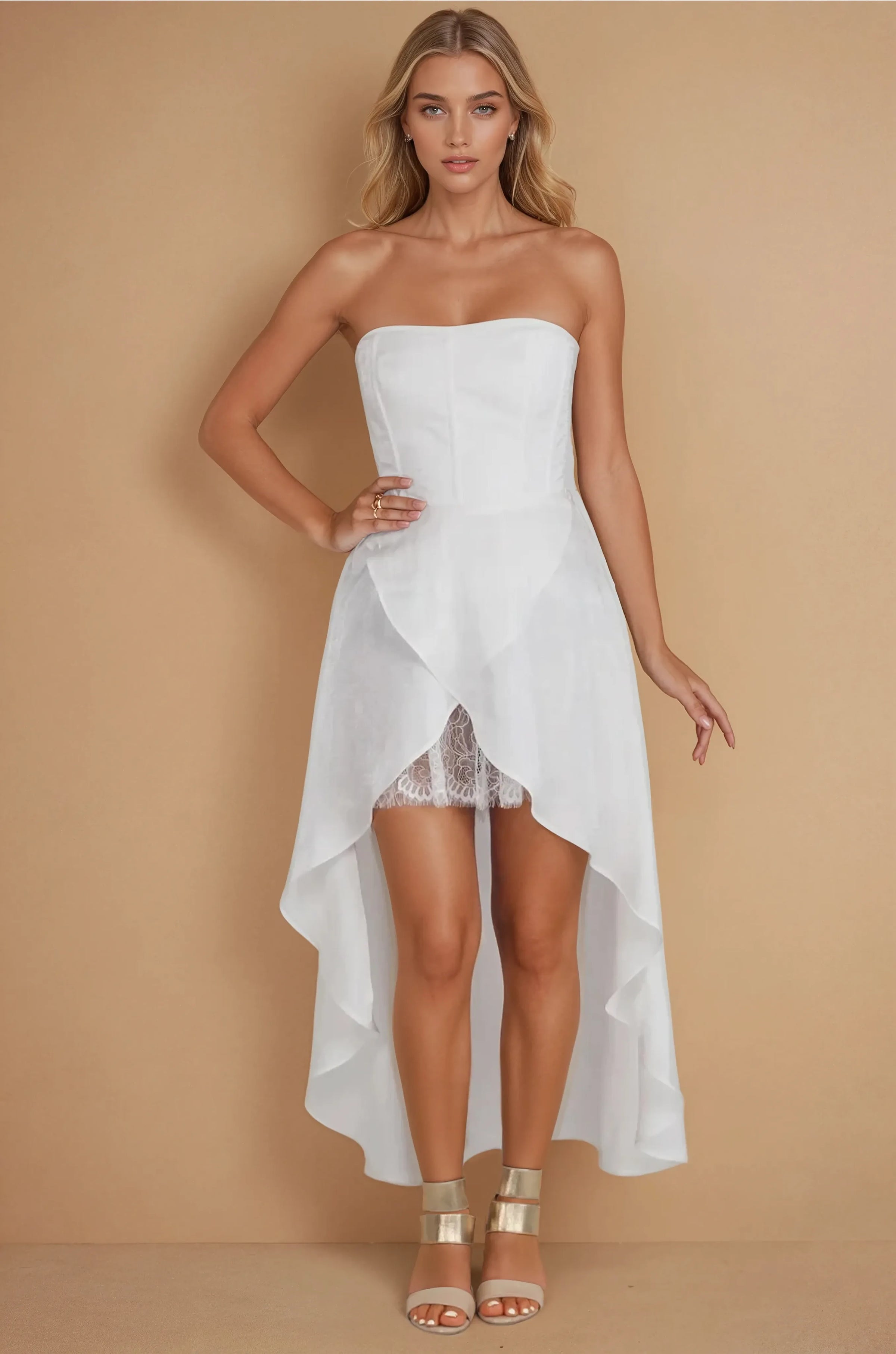 Step into effortless elegance with this strapless white viscose corset dress, perfect for modern romantics. The structured bodice features spiral boning and soft cotton lining for a supportive and flattering fit, while the smooth, lightweight viscose fabric drapes beautifully. A cascading high-low overskirt reveals delicate lace shorts underneath, adding a playful and feminine touch. Ideal for bridal events, special occasions, or chic celebrations where you want to make a graceful, unforgettable entrance.