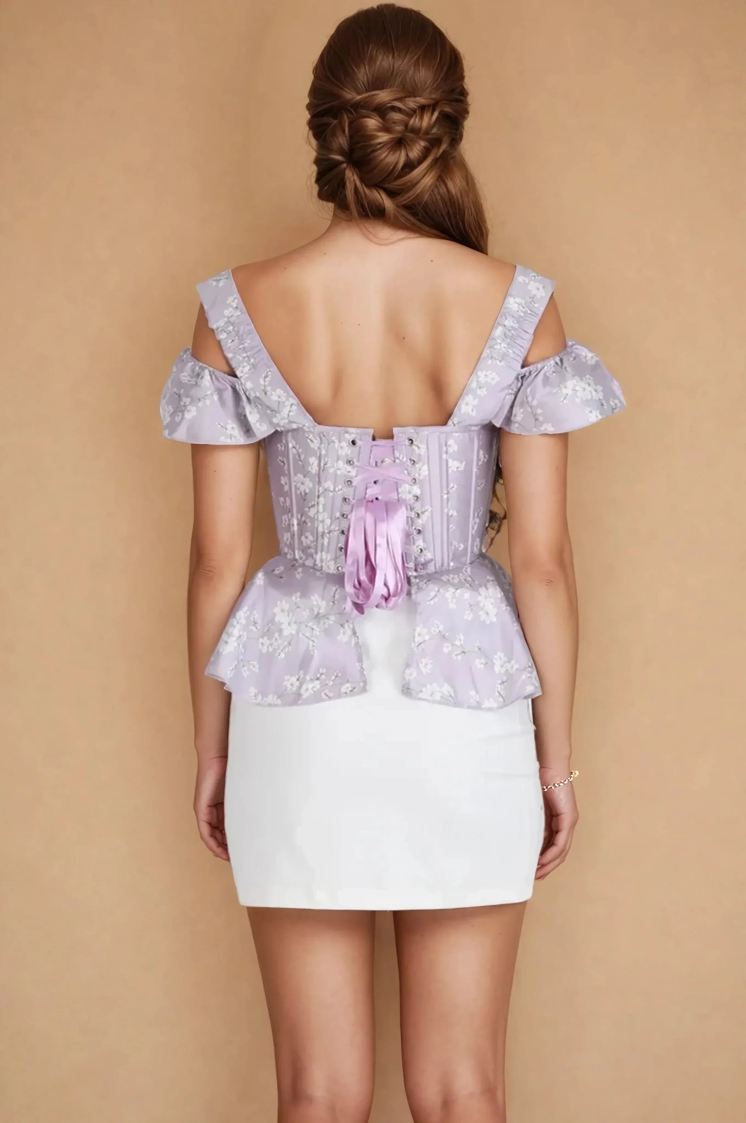 Add a dreamy touch to your look with this elegant overbust corset, crafted from delicate floral-printed taffeta in a soft lavender hue. Designed with spiral boning and lined with breathable cotton for a supportive, comfortable fit, this corset beautifully sculpts the silhouette. The flared peplum waist and romantic ruffled off-shoulder straps enhance its feminine charm, making it perfect for pairing with skirts, tailored pants, or layered outfits for garden parties, brunches, or special occasions.