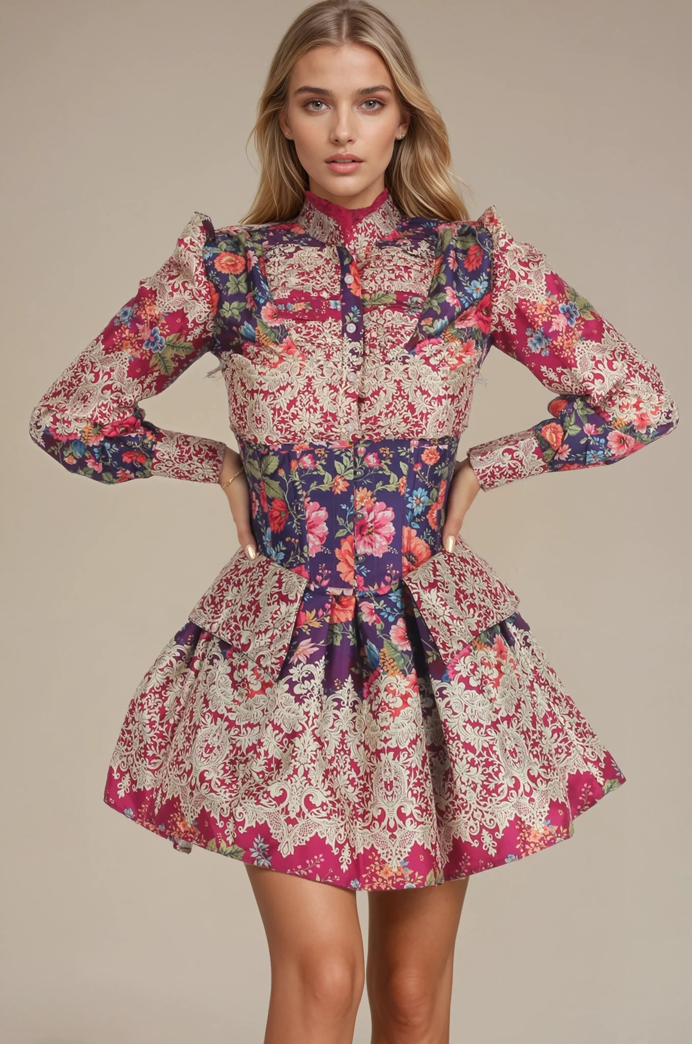 Shirt: Featuring a high, lace-trimmed collar and elegantly puffed sleeves, the shirt ties the entire look together. Its rich mix of floral and baroque patterns creates a perfect balance between vintage romance and modern extravagance.